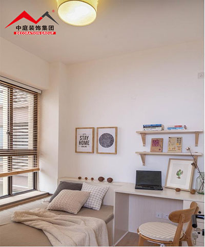 原木質(zhì)感搭配時(shí)尚白色的墻,在飄窗的襯托下顯得很有情調(diào);