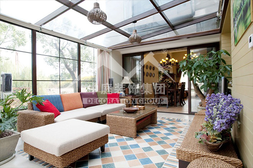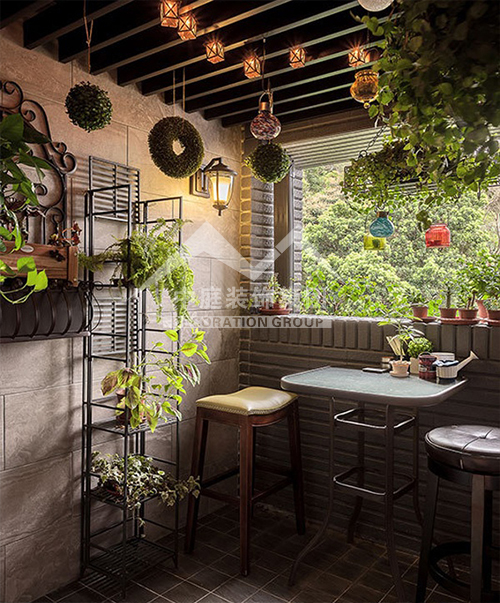 如果是陽臺(tái)面積較大又位于頂樓,應(yīng)該屬于“露臺(tái)”??稍陉柵_(tái)上加透明的弧形采光頂,就可使陽臺(tái)當(dāng)作房間使用。陽光通過采光板灑向用文化石做的墻壁,以及青石板鋪成的地面,而且也照亮了“人”字型的鵝卵石小徑……這些園林造景手法,用在陽臺(tái)上,會(huì)給人濃濃的休閑氣息。