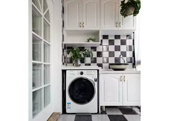 可以選擇把陽臺(tái)改成洗衣區(qū),上面有吊頂。是最省錢的,上面還可以儲(chǔ)物,放東西。還有洗手盤,平時(shí)可以洗點(diǎn)衣服這樣。