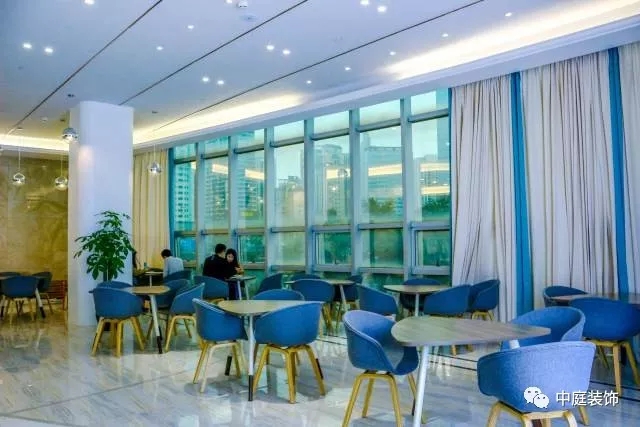 工作區(qū)與大廳的富麗堂皇迥然不同,藍(lán)色座椅十分清新!