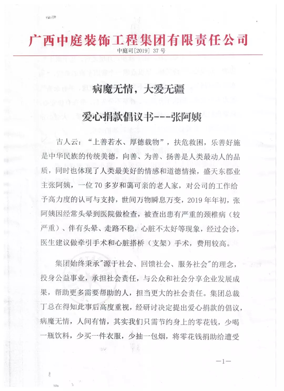 集團(tuán)總裁丁胡先生向全體員工號(hào)召,為張阿姨獻(xiàn)出一份愛心。捐款不分多少,貴在有份愛心,只要我們?nèi)巳硕寄芨冻鲆稽c(diǎn)愛、將小愛匯聚成大愛,大愛必定驅(qū)趕病魔,大愛定能早日治愈張阿姨的疾病。