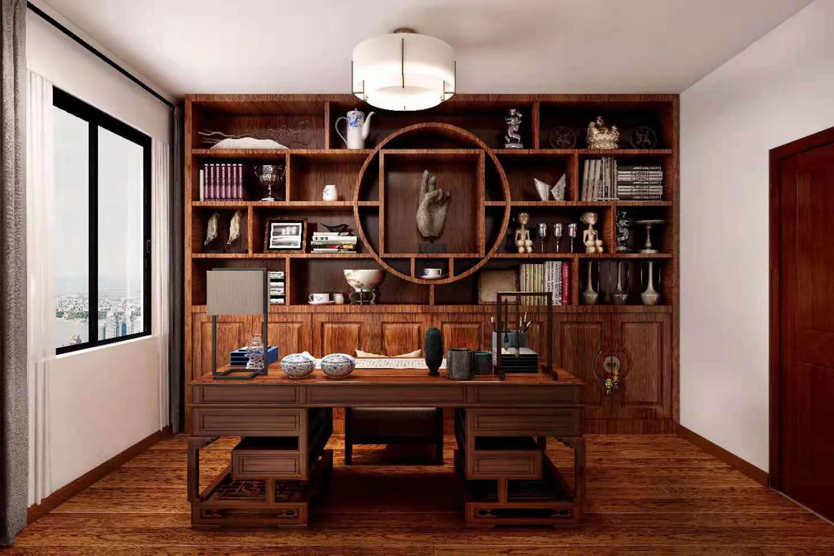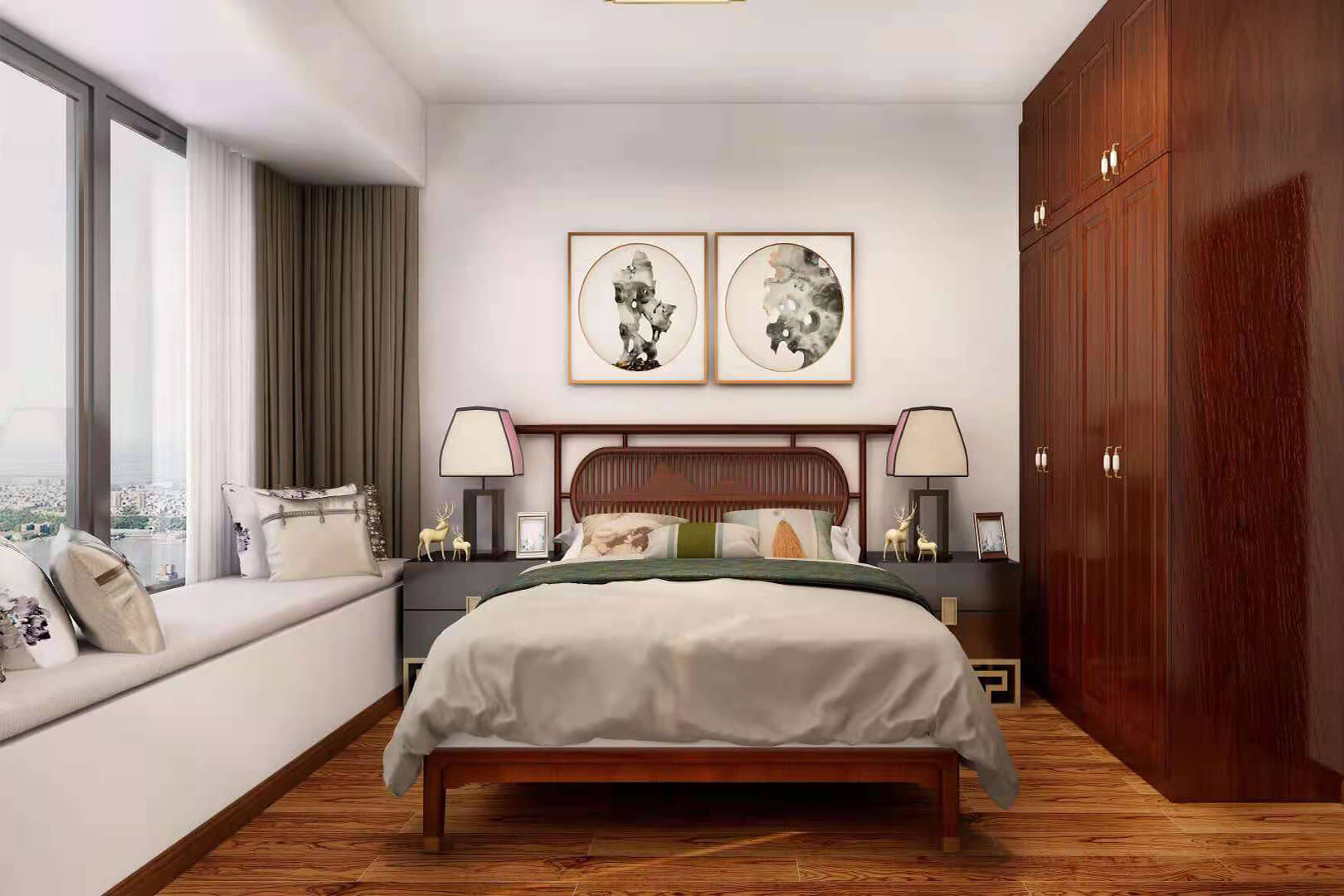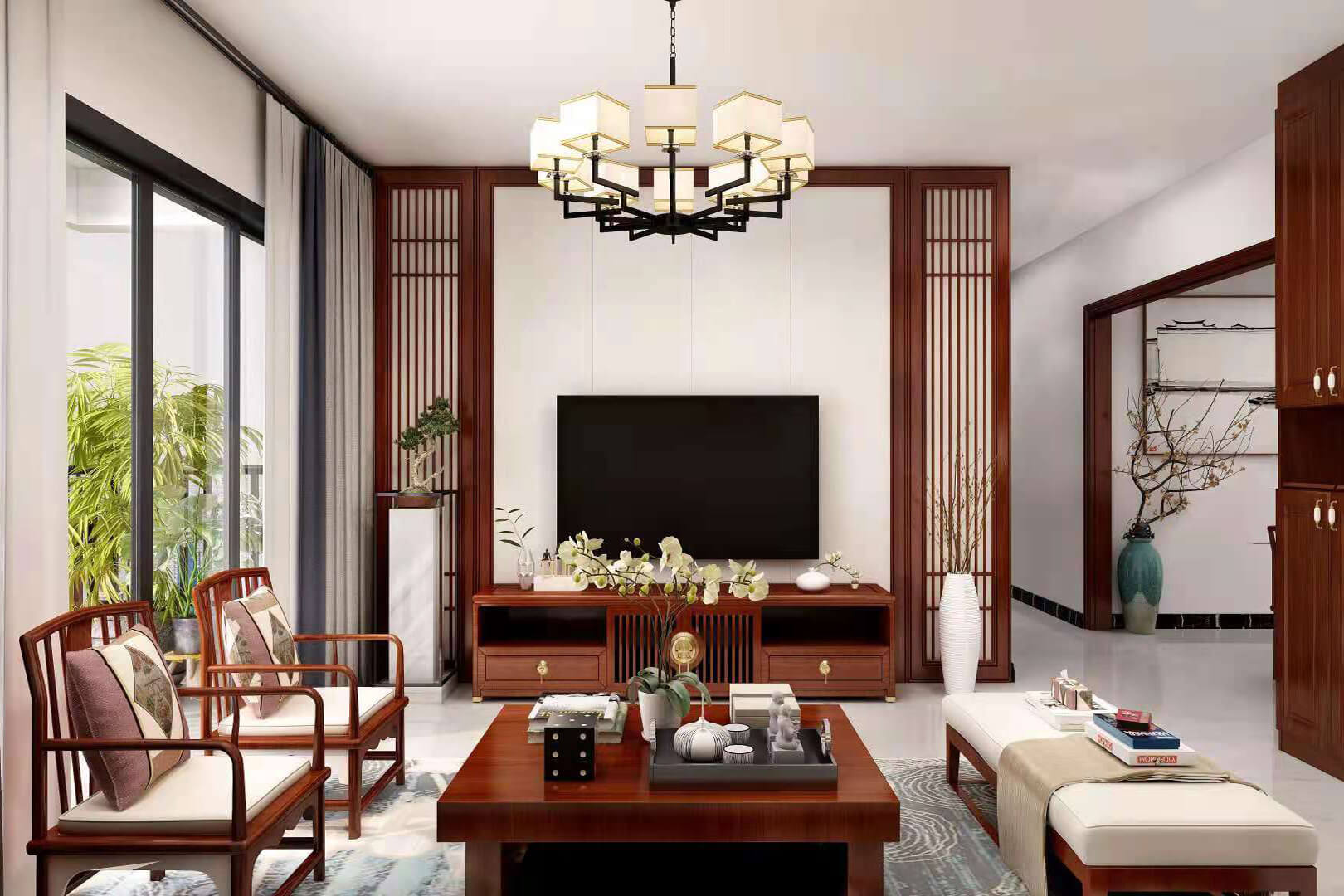 瀏覽量:552房子整體家具以紅木為主??蛷d采用白色地磚和留墻面與家具搭配讓顏色看起來更為簡潔,不做裝飾的吊頂讓整體的空間看起來更寬大。房間采用紅木地板與房間家具色彩呼應,墻面留白用水墨畫裝飾讓房間裝飾更豐富,也讓色彩更多了層次感。