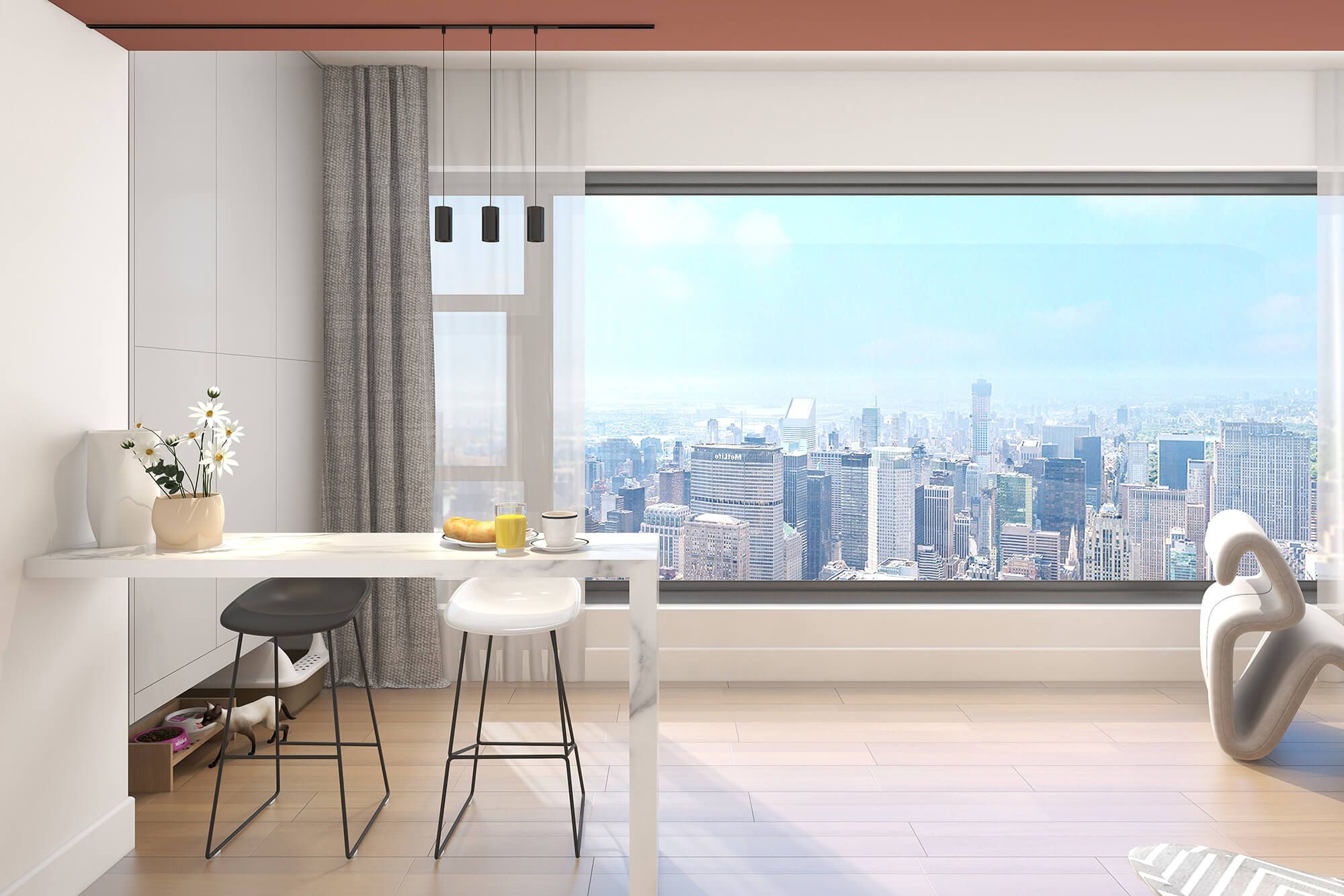 瀏覽量:444本案設計師基于人與動物、環(huán)境之間的大融合的考慮,實現了人們想要追求的一種泛空間,家庭不再是以空間而定位,而是以氛圍而定位。比如說男女主人在辦公的時候,可以在客廳、餐廳跟貓咪玩耍,或者在做飯的時候也能夠和外面的人互動,空間既獨立又融合。
