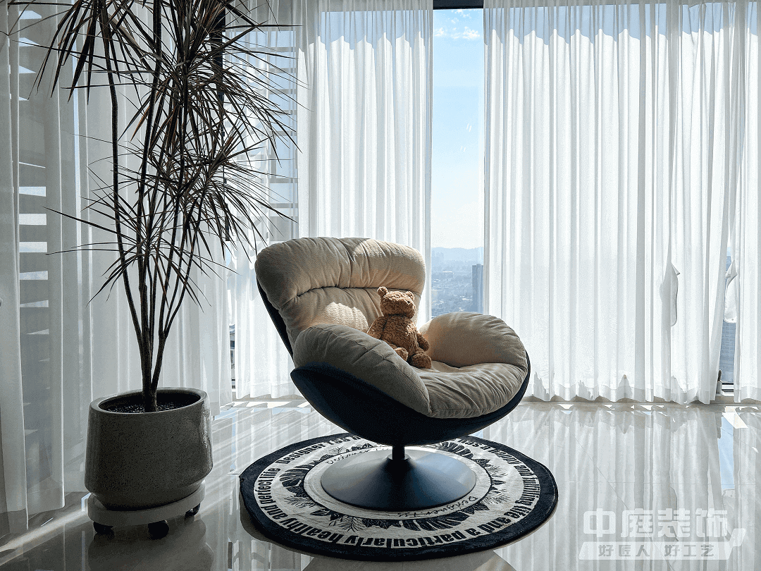 陽臺:為了不浪費南面的湖景,規(guī)劃開放式陽臺,用以解決洗衣和收納雜物的問題,放上躺椅休息時直面一片風(fēng)景,身心舒暢。
