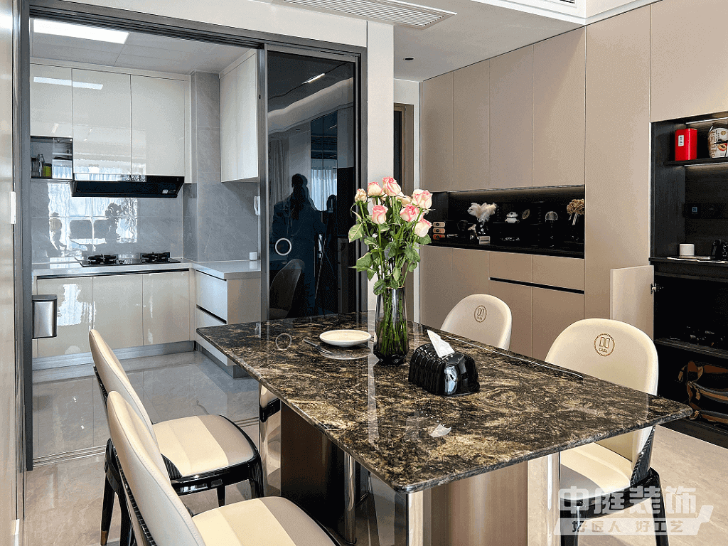 餐廳:開放廚房與餐廳結(jié)合,形成餐、廚一體空間。所有廚房電器嵌入式設(shè)計,并按照業(yè)主烹飪習(xí)慣布置,保證操作動線便捷、合理。