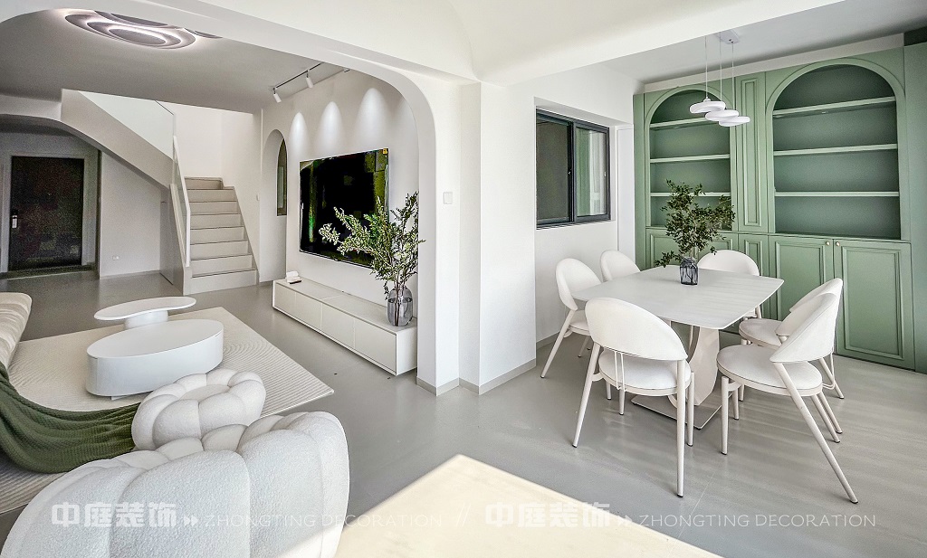 這一套綠意盎然的奶油風(fēng)格好似把森林搬進(jìn)了家,軟乎乎的奶白沙發(fā)搭配苔蘚綠毛毯,抱枕選了粉綠撞色,往上面一躺,一天的疲憊都被融化了!圓潤的白色組合茶幾,顏值與實用并存,氛圍感直接拉滿。墻面掛畫大葉綠植藝術(shù)畫,角落擺放鮮活綠植,將自然綠意融入空間。