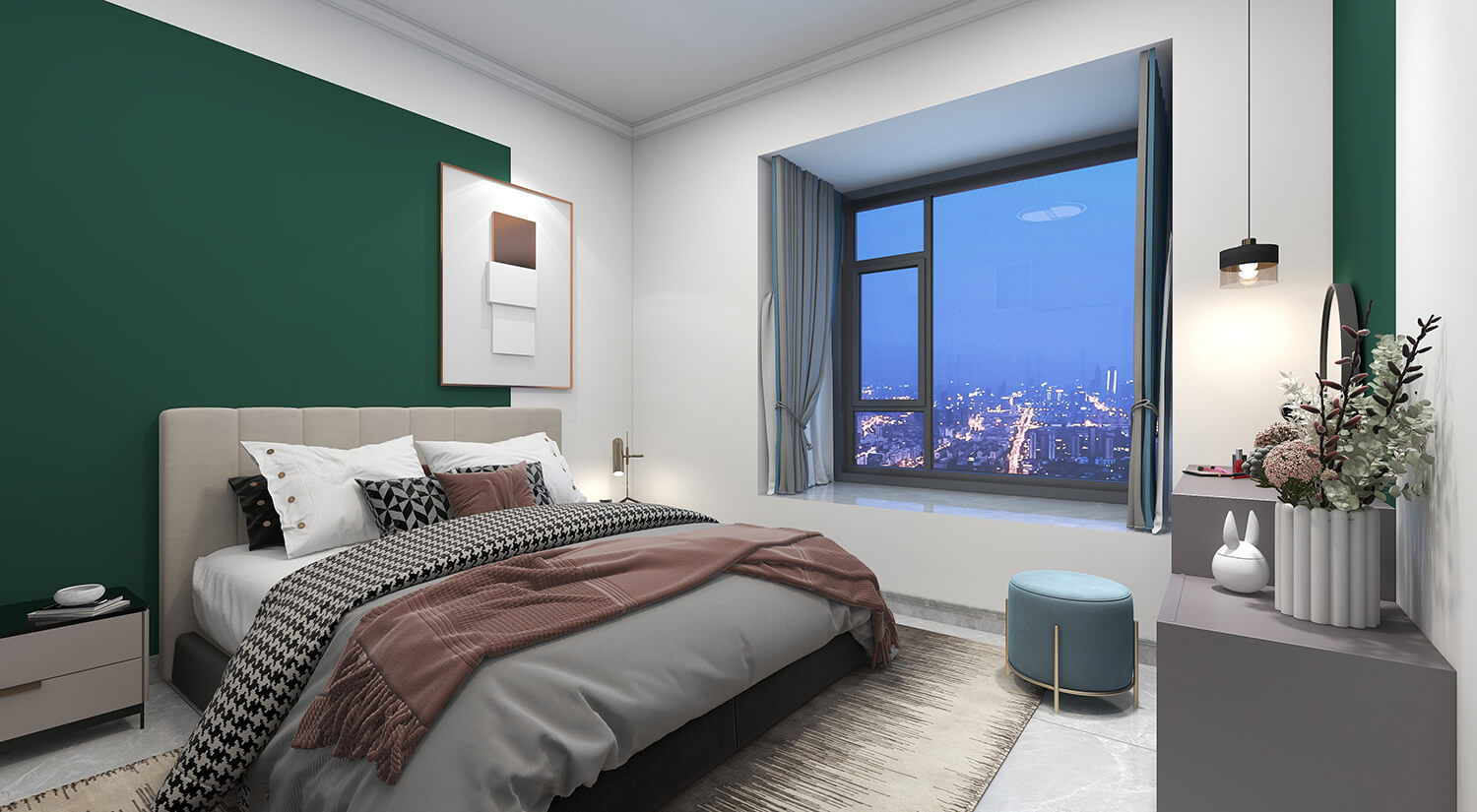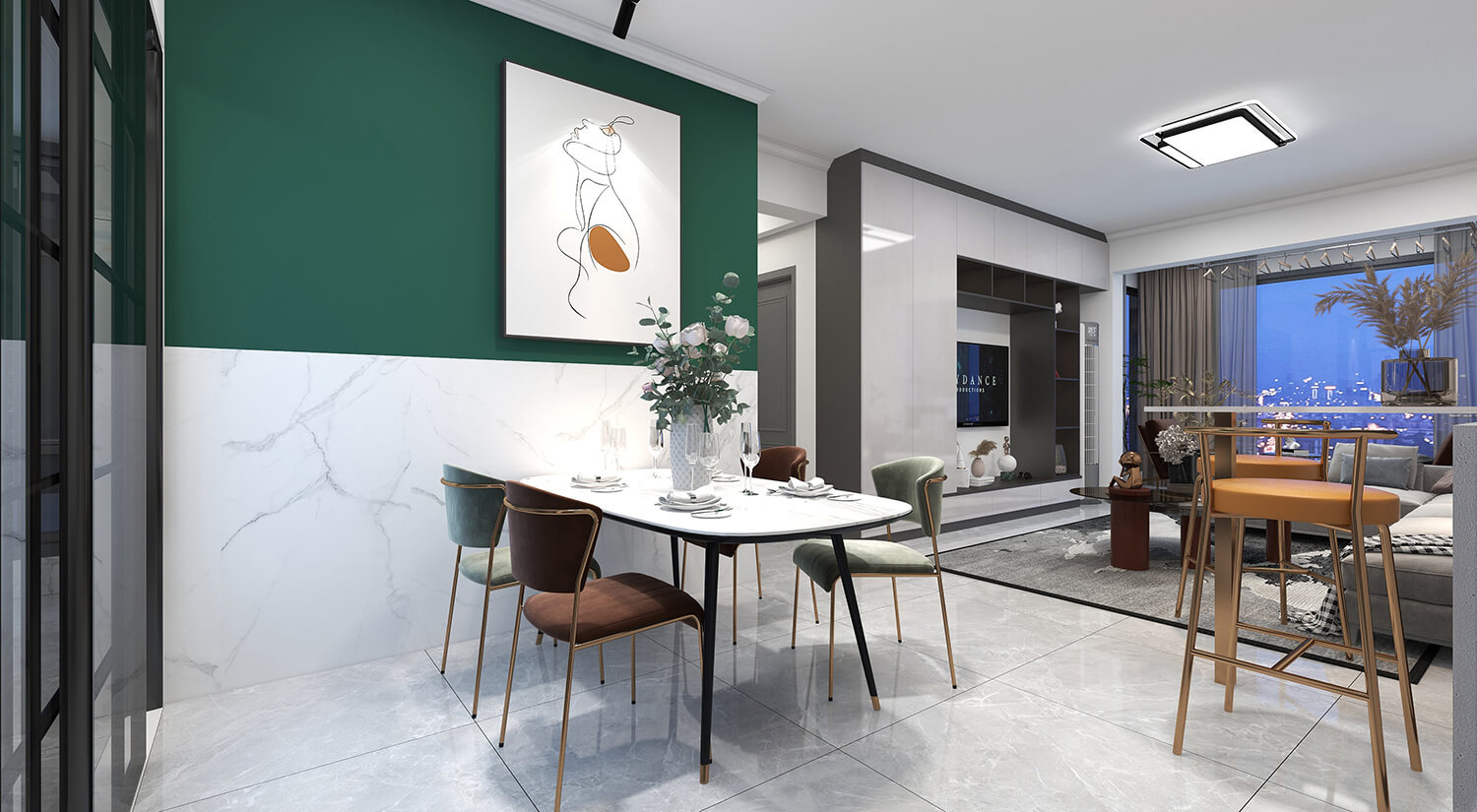 本案例戶型為:4房1廳2衛(wèi),總面積130㎡。墻壁、地板和天花板的顏色選擇明亮的白色,并搭配少量的深綠色作為點綴。在各種金屬質(zhì)感家具元素的襯托下,整體現(xiàn)代感十足。