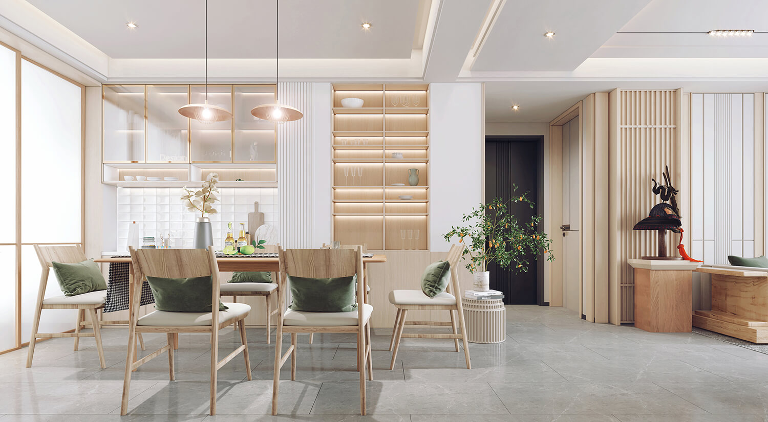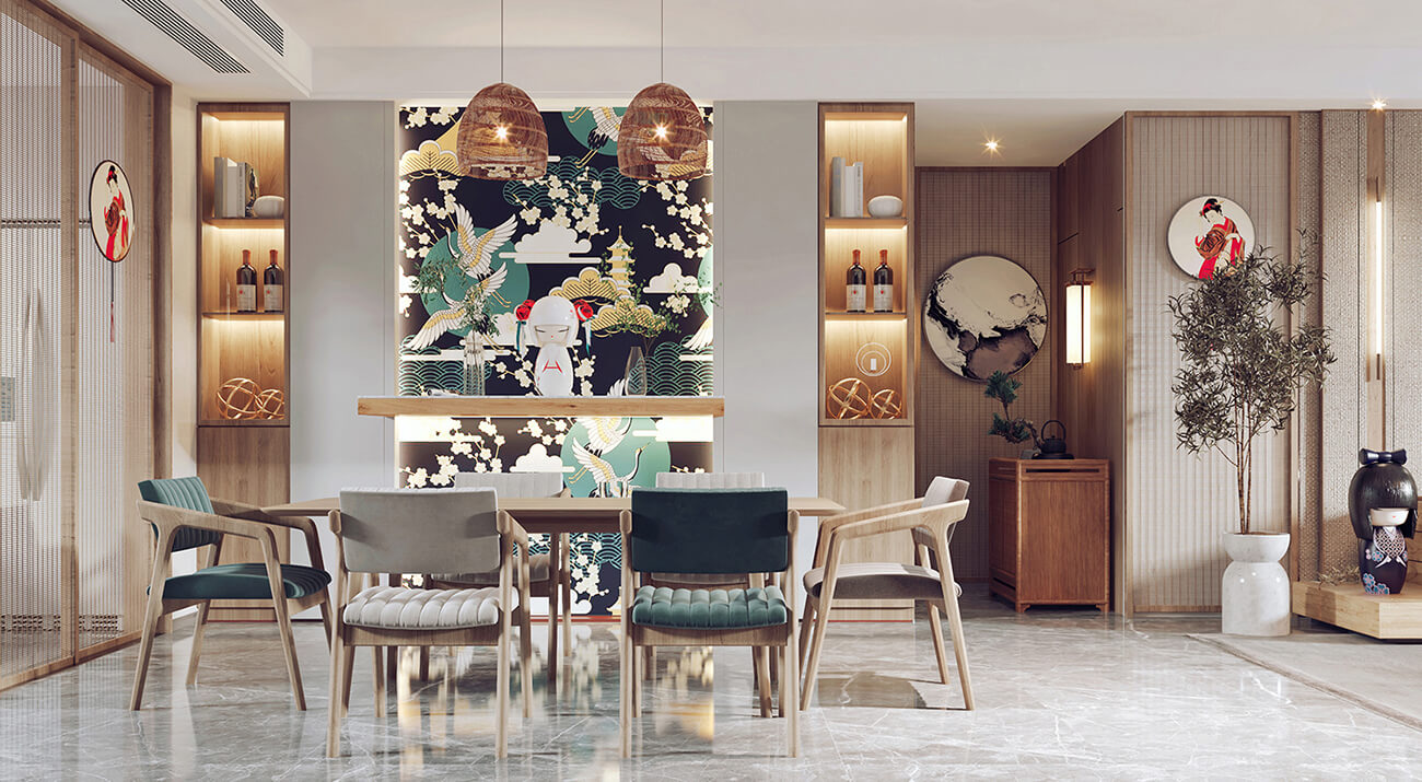 日式室內(nèi)設(shè)計(jì)也注重利用空間的高度和深度。天花板常常被設(shè)計(jì)為極高的,以營(yíng)造一種開放和自由的氛圍。