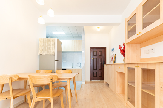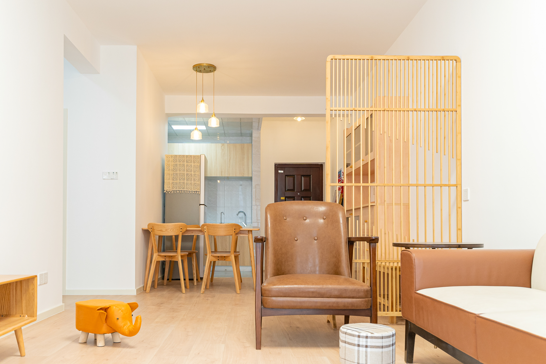 整個空間基于原木風(fēng)格上做搭配,陽臺打通,解決不互通的采光問題,天氣陰晴,都可以為空間做天然點綴;開放式廚房和餐廳可以共享操作,互不干擾,又可以加強家人之間的互動性提高家庭的幸福感。