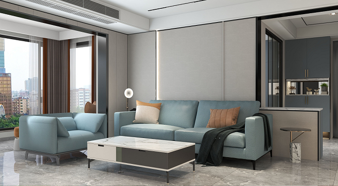 整個空間變得更加寬闊通透,視野也有一定的拓展,藍色系的空間在整個空間當中變得更加大氣,再加上灰綠色的布藝沙發(fā),灰色的茶幾在色調(diào)上有的用的沖擊性豐富了整個空間當中的層次。