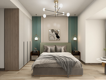 主臥的套房設(shè)計,主臥,衣帽間,書房一體化可以給業(yè)主更強的居住獨立性以及舒適感。整體延續(xù)了客廳的風(fēng)格,白色與綠色之間的碰撞,與客廳互相呼應(yīng),橙色的懶人椅作為整個空間的點綴色。照明以主燈加上床兩側(cè)的吊燈做陪襯,讓整個空間顯得很有層次更有情調(diào)。