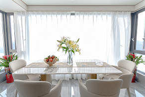 客餐廳采取一體化的設(shè)計,通透寬敞視覺增加了整體空間的層次感,餐廳背景墻與客廳采用不同色調(diào)以及材質(zhì)的家具予以區(qū)分與以協(xié)調(diào),達成相輔相成之美。上方的蜿蜒燈盞猶如熱帶叢林的藤曼,座椅的顏色同色系著客廳的色彩,設(shè)計師得心應(yīng)手以材料與色彩營造空間氛圍。
